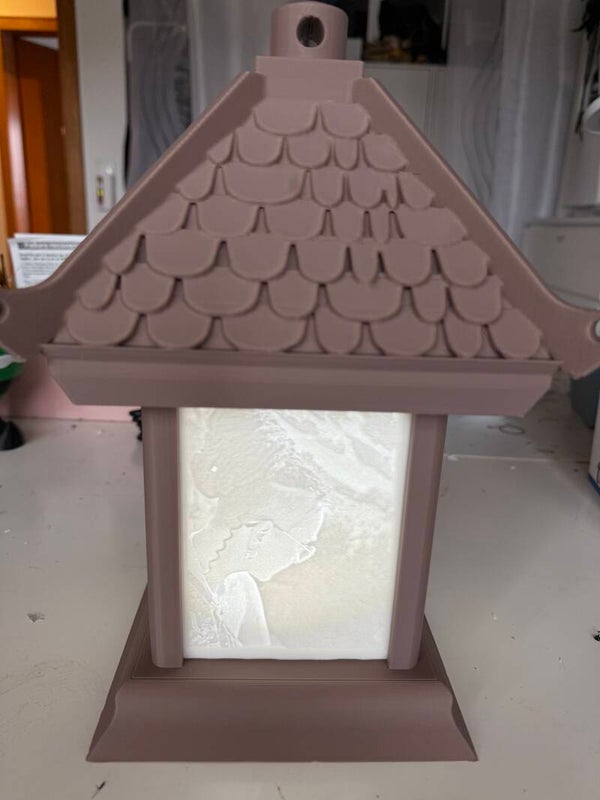 Hier werden 4 Lithophaneplatten in der Größe cm x cm gedruckt, die bei Wunsch durch andere ersetzt werden können. Diese Leuchte benötigt keine Stromquelle, sondern wird durch eine LED Leuchte erhellt.